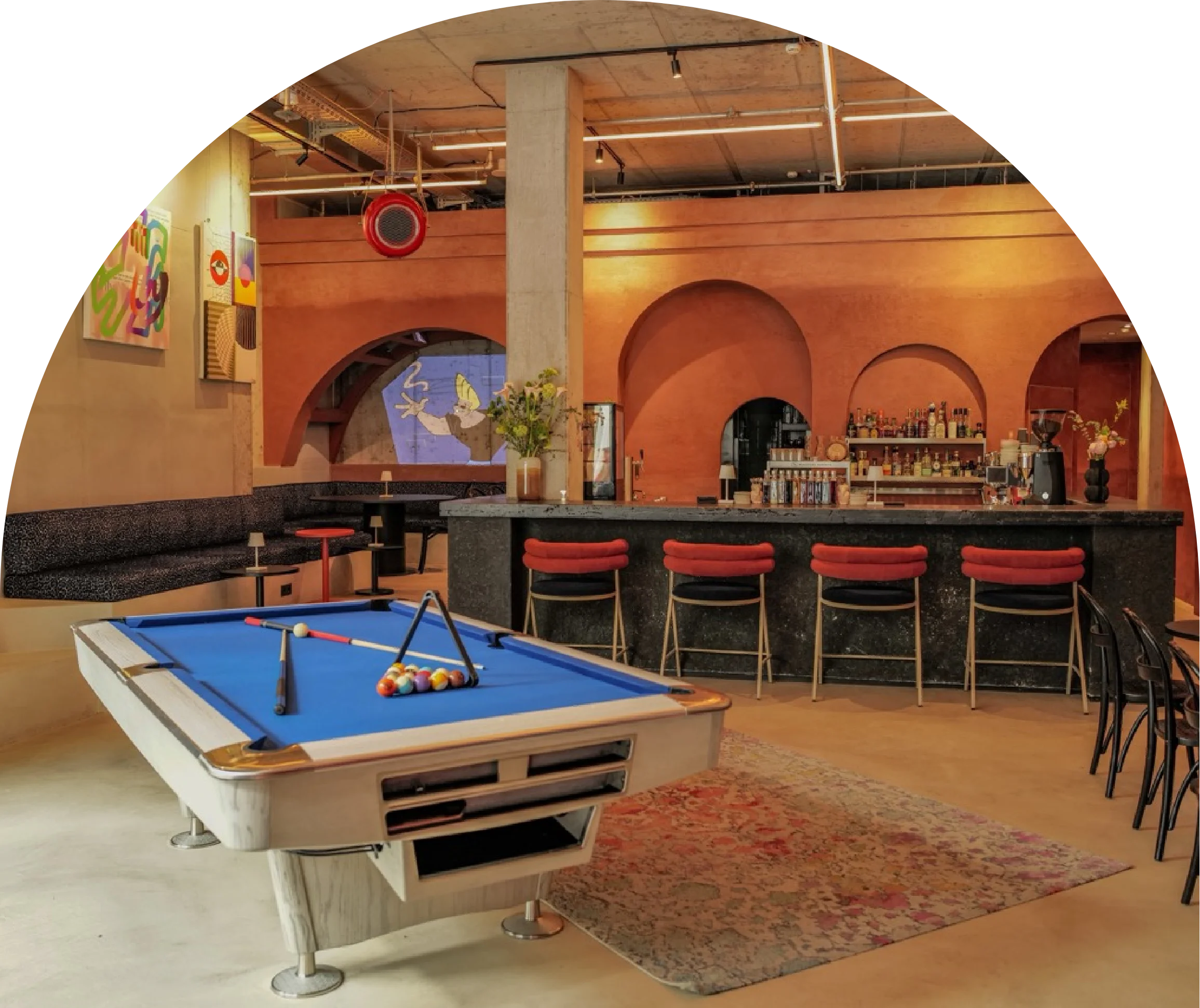 Nachmittags ein entspannter Ort für Kaffee, Laptops oder Gespräche, wandelt sich der Raum abends zur lebendigen Bar - mit kreativen Drinks, einem zentralen Billardtisch und wechselnden Ausstellungen.